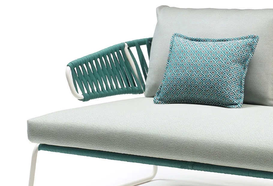 The woven backrest made of nautical rope is softened by soft cushions: the colour range plays on the freshness of summer and gives this sofa personality and warmth.