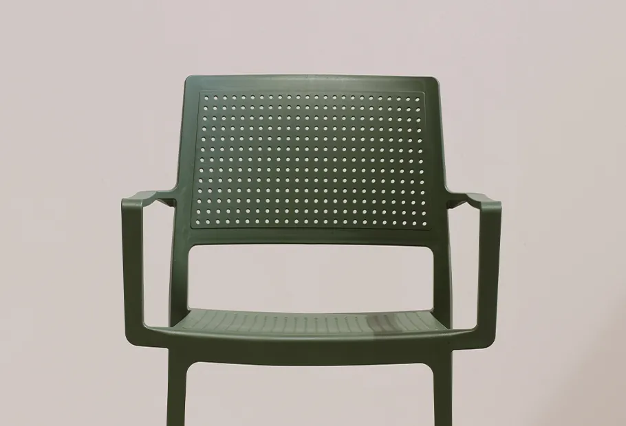 La structure entièrement en technopolymère et les trous en font un produit idéal pour les espaces extérieurs, privés ou collectifs ; la forme particulière des pieds crée une solution technique unique qui permet de l'empiler parfaitement sans laisser de joints, exceptionnellement stable. Disponible avec et sans accoudoirs, en différentes couleurs, également sur palette.