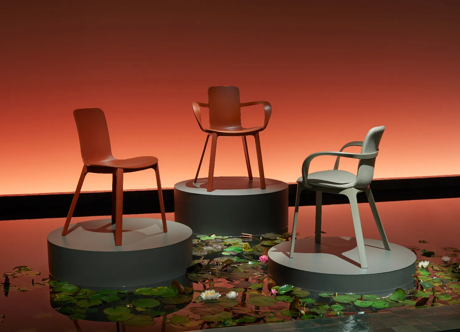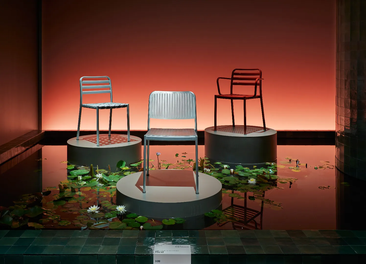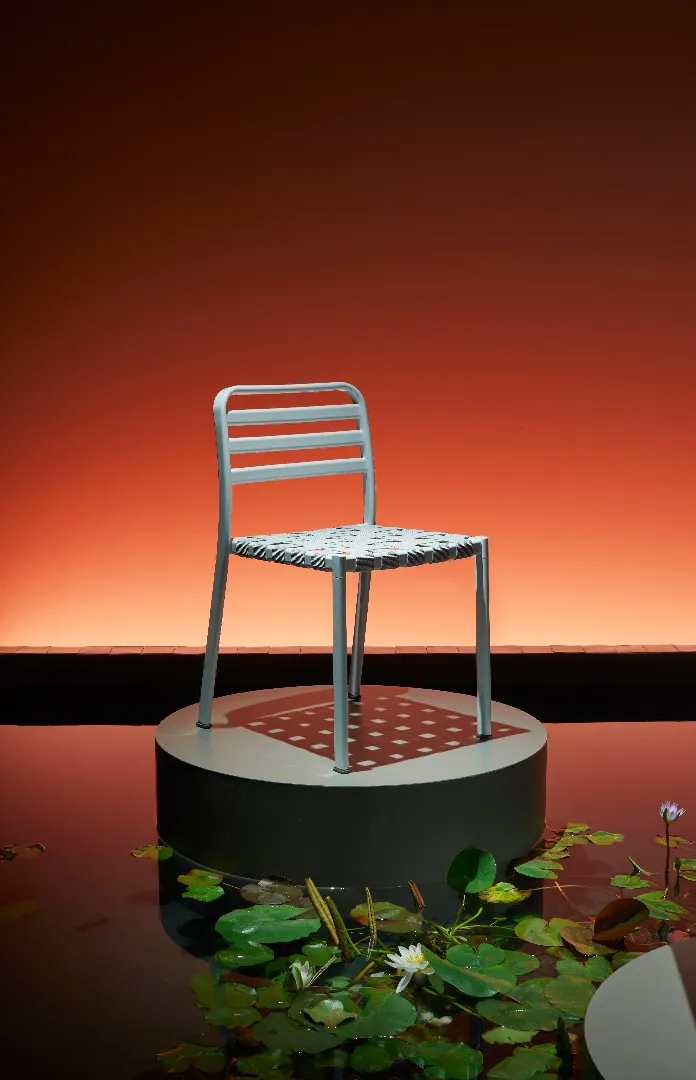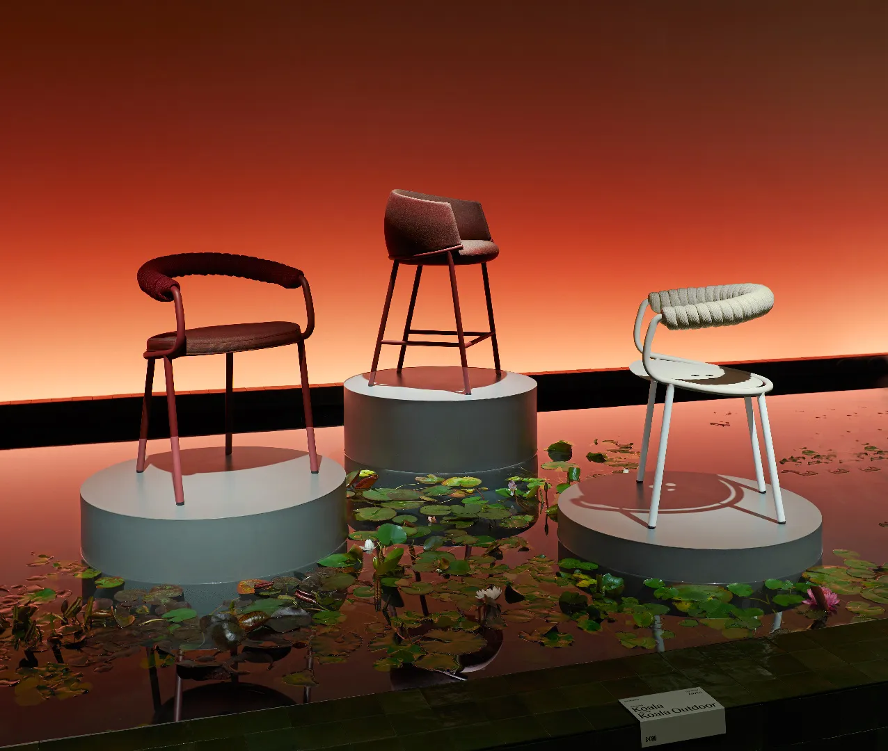 Cuore scenografico del progetto è la ricostruzione di uno stagno con piante acquatiche, pensato come dispositivo narrativo e sensoriale: un paesaggio controllato, quasi teatrale, che accompagna il visitatore in un percorso di scoperta. In questo contesto, i pezzi di design vengono presentati come piante rare, come fiori esotici da osservare da vicino: oggetti-icona messi in risalto da una regia discreta, capace di enfatizzarne unicità e valore.