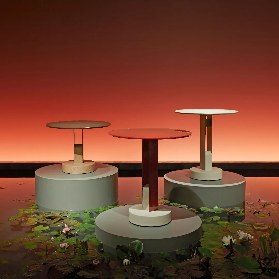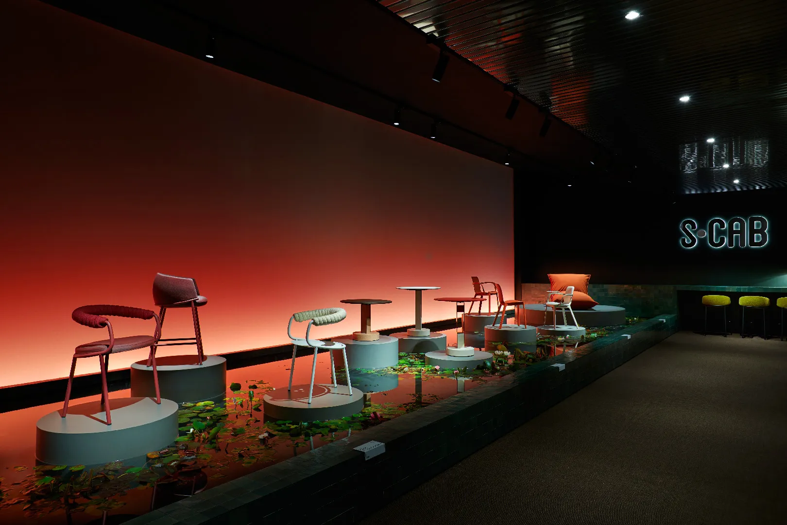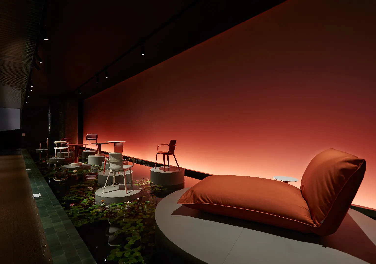Cuore scenografico del progetto è la ricostruzione di uno stagno con piante acquatiche, pensato come dispositivo narrativo e sensoriale: un paesaggio controllato, quasi teatrale, che accompagna il visitatore in un percorso di scoperta. In questo contesto, i pezzi di design vengono presentati come piante rare, come fiori esotici da osservare da vicino: oggetti-icona messi in risalto da una regia discreta, capace di enfatizzarne unicità e valore.
